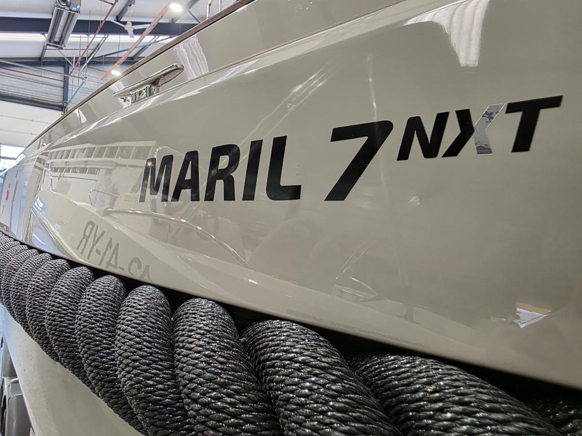 De Maril 7NXT sloep heeft een lengte van 7,50 m en een breedte van 2,85 m. Deze afmetingen, gecombineerd met het vlakke onderwaterschip, zorgen voor veel stabiliteit en vaarcomfort. Achterin de spiegel beschikt de sloep over een doorgang welke toegang biedt tot het geïntegreerde zwemplateau. Dit is uitermate functioneel tijdens het zwemmen, om eenvoudig in en uit de boot te klimmen.