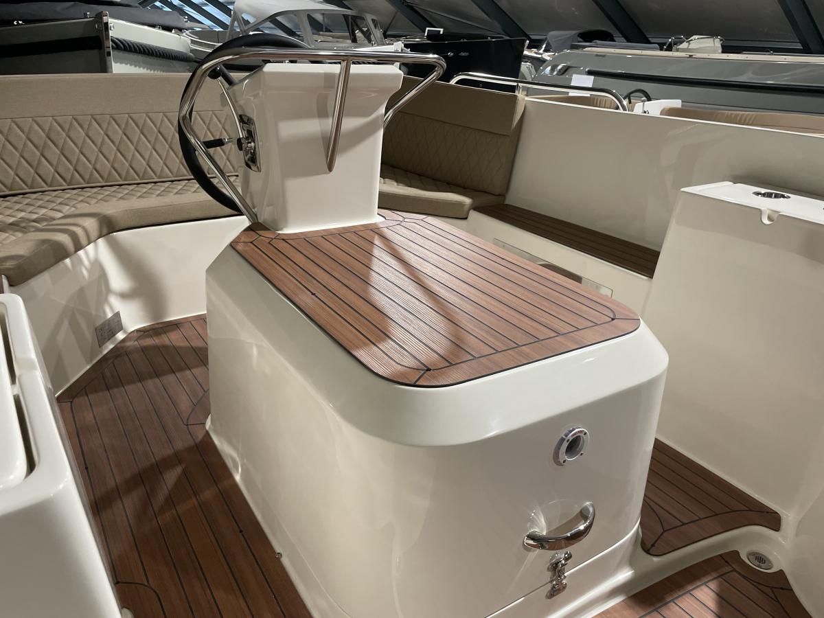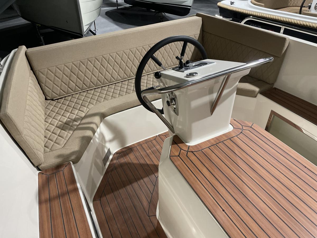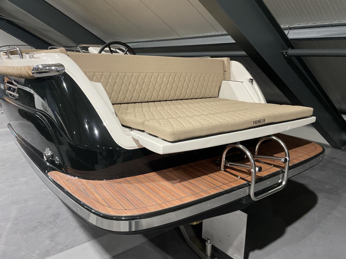 Wat deze sloep echt onderscheidt, is de praktische en slimme indeling van het achtergedeelte. Hier kan eenvoudig een zonnedek worden gecreëerd, dat net zo snel weer ingeklapt kan worden. Zo schakelt u moeiteloos tussen extra zitruimte en een royaal ligoppervlak.