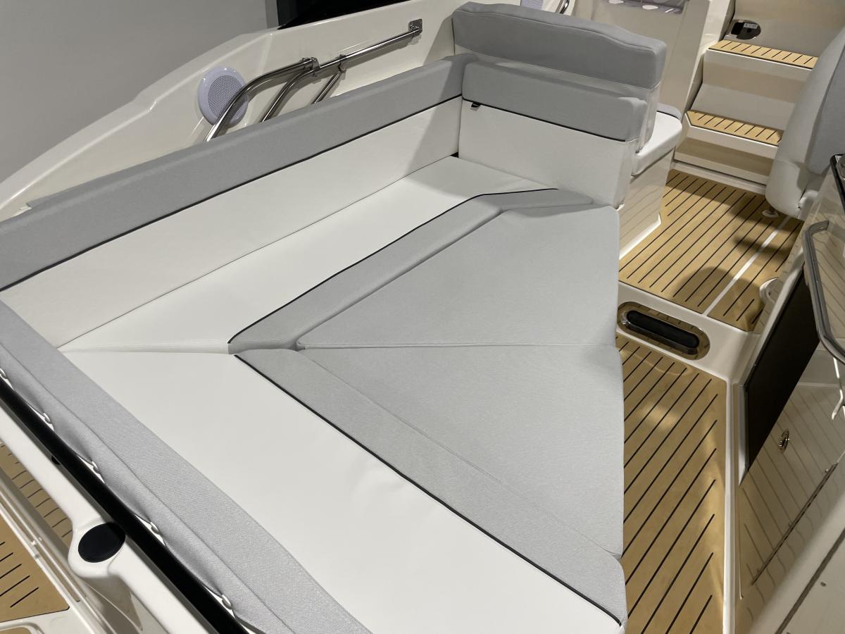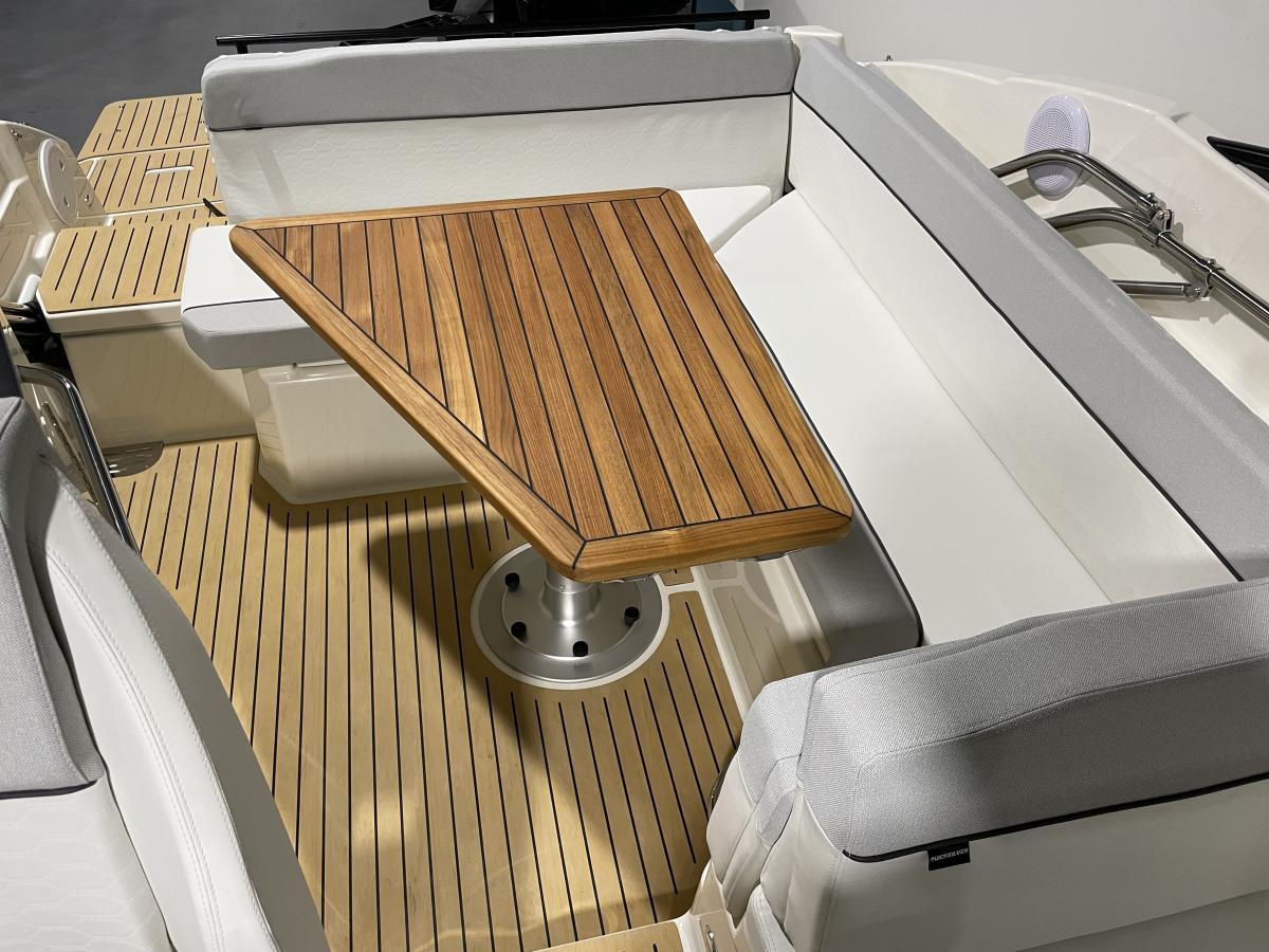 Deze speciale jubileumuitvoering valt direct op door de lichtgrijze romp en de stijlvolle witte bekleding, wat de boot een moderne en chique uitstraling geeft.