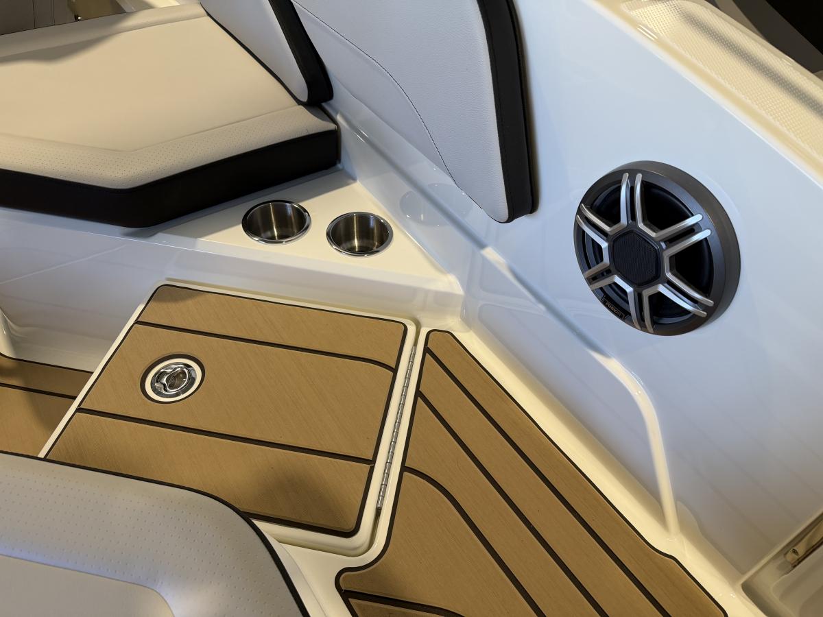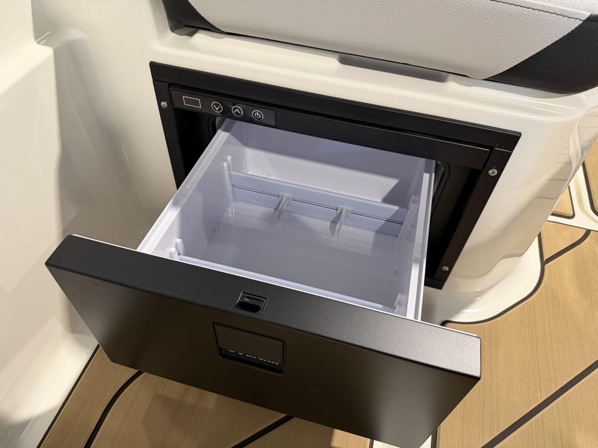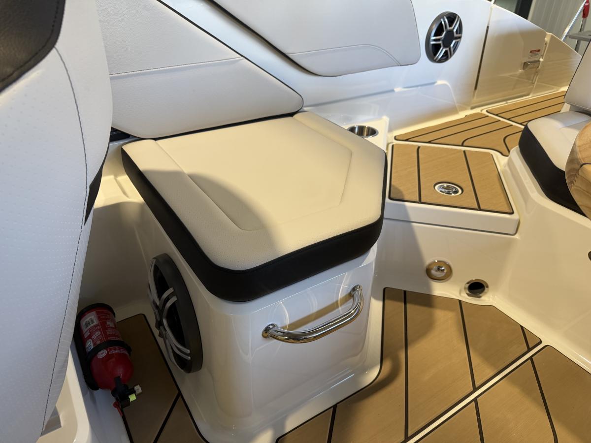 De boot beschikt over een modern Simrad navigatiescherm, een krachtig audiosysteem met subwoofer en versterker voor een indrukwekkende geluidsbeleving, en een handige koellade om je drankjes altijd koel te houden. De sfeervolle blauwe kuipverlichting zorgt voor een luxe uitstraling, vooral tijdens avondvaarten.