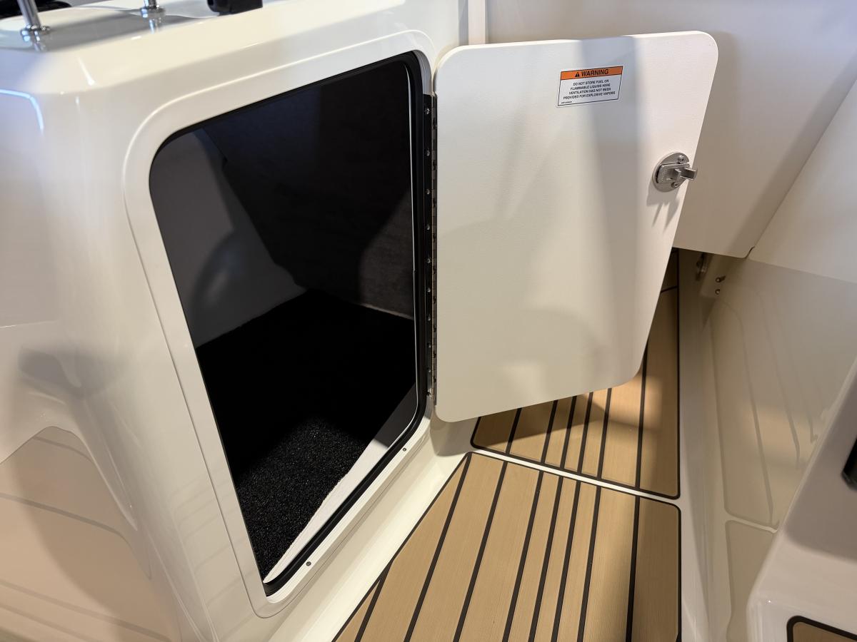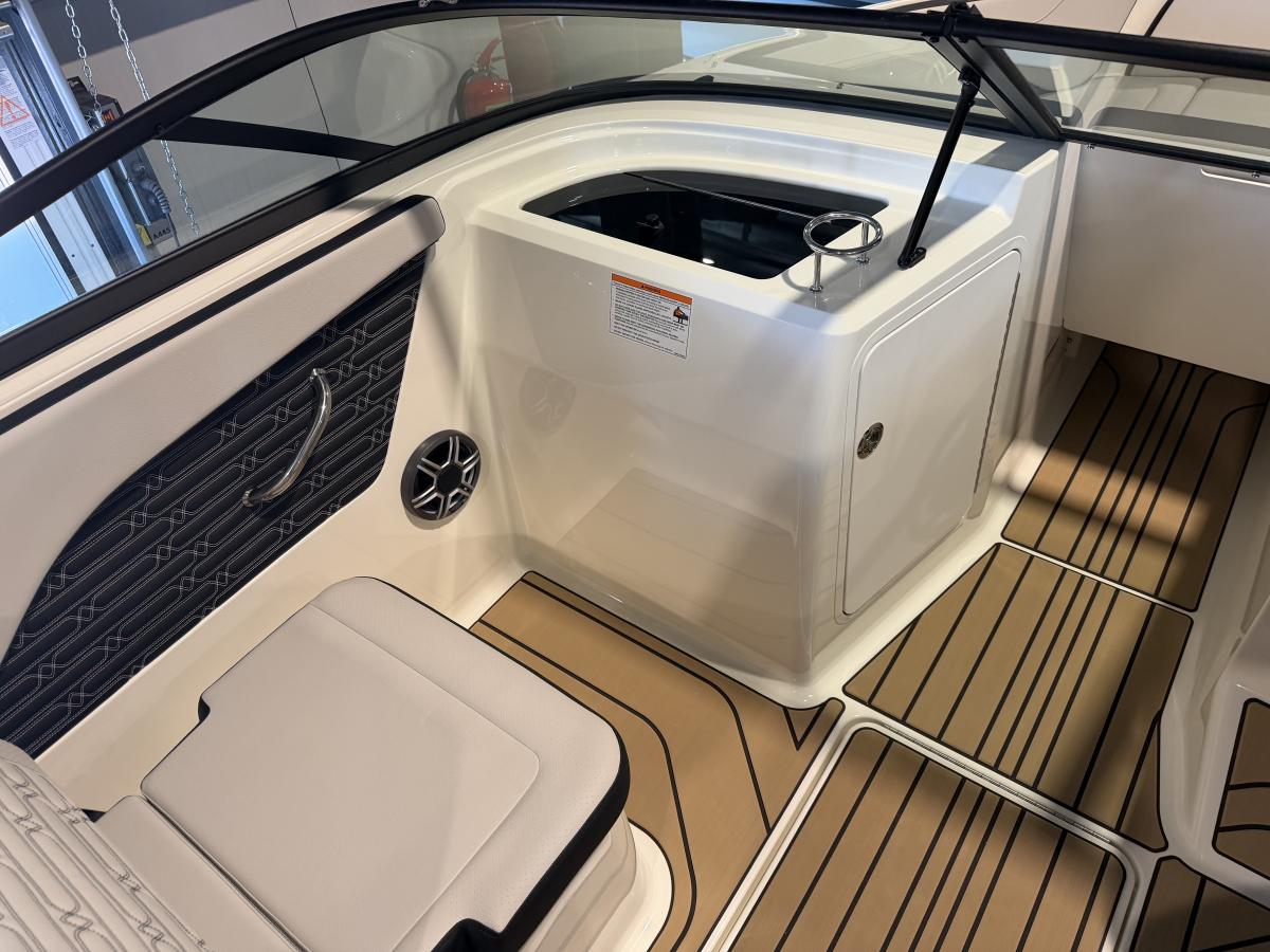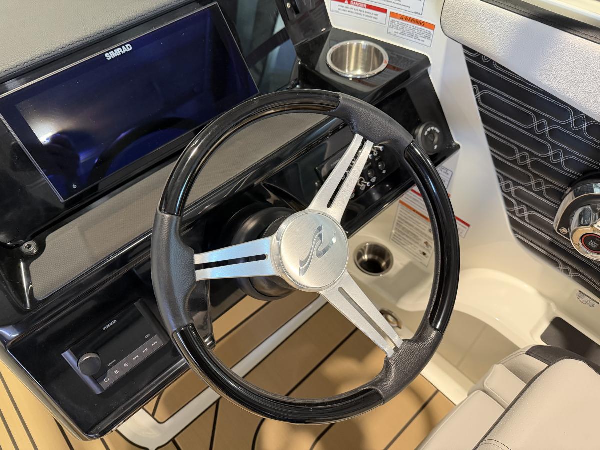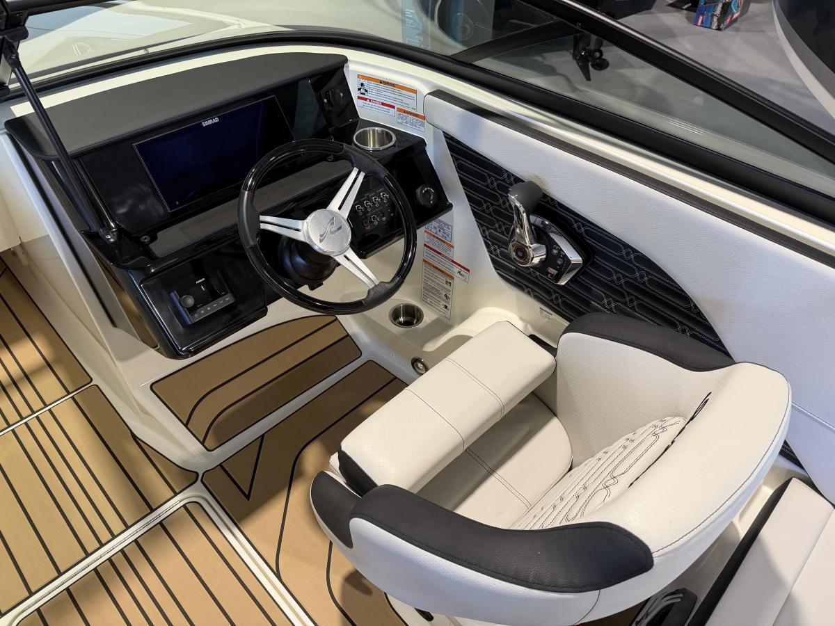 De boot beschikt over een modern Simrad navigatiescherm, een krachtig audiosysteem met subwoofer en versterker voor een indrukwekkende geluidsbeleving, en een handige koellade om je drankjes altijd koel te houden. De sfeervolle blauwe kuipverlichting zorgt voor een luxe uitstraling, vooral tijdens avondvaarten.
