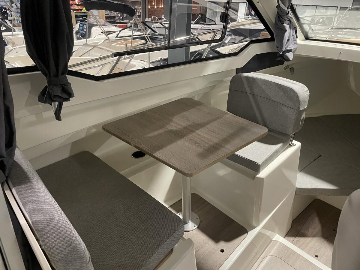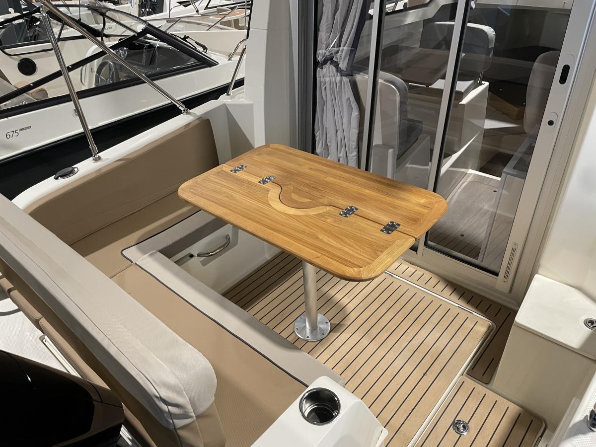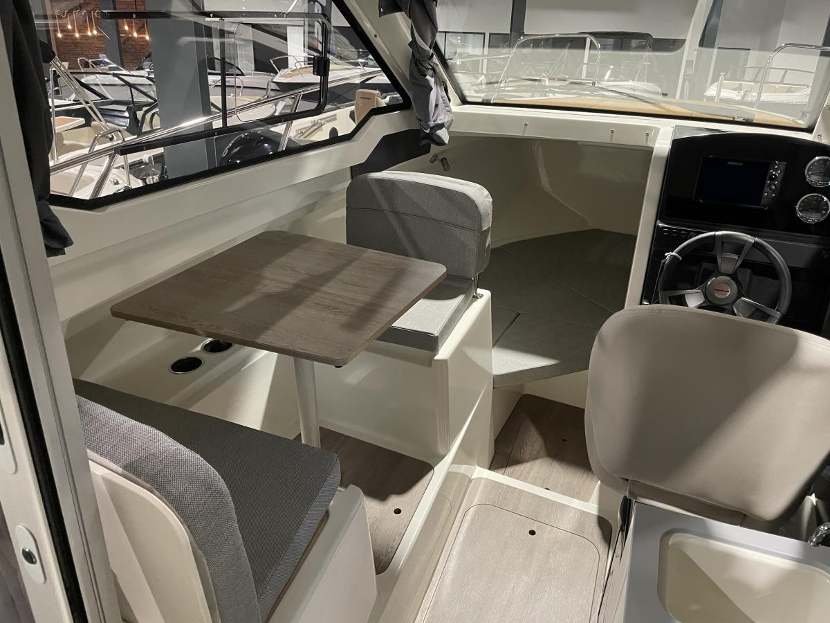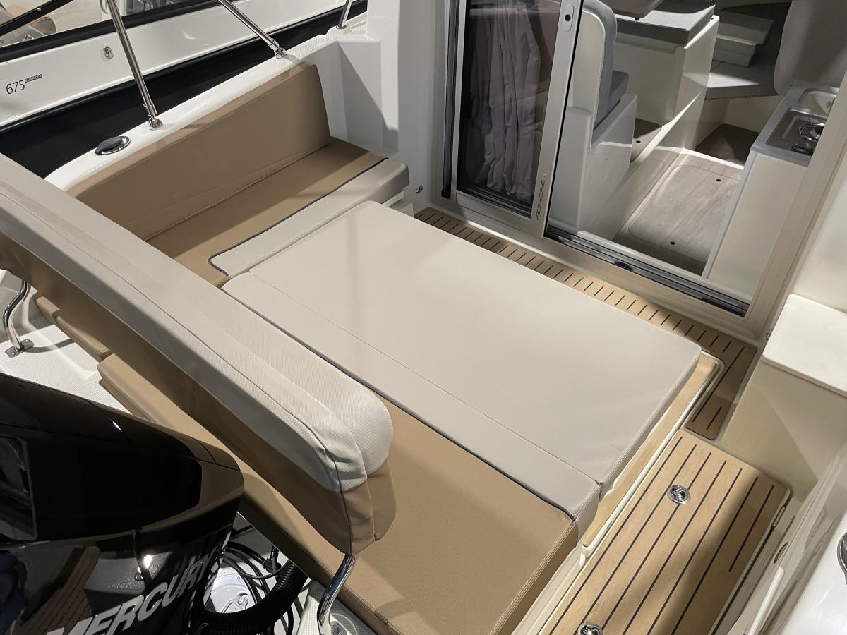 De 675 Weekend heeft achterin de kuip een ruime hoekbank en de schuifpui biedt toegang tot de ruime cabin. Hier is een tafel met 2 banken en een flip-up bestuurdersstoel. Er is een keukenblokje aanwezig met wastafel en gaspit. De banken kunnen omgebouwd worden tot een derde slaapplek.