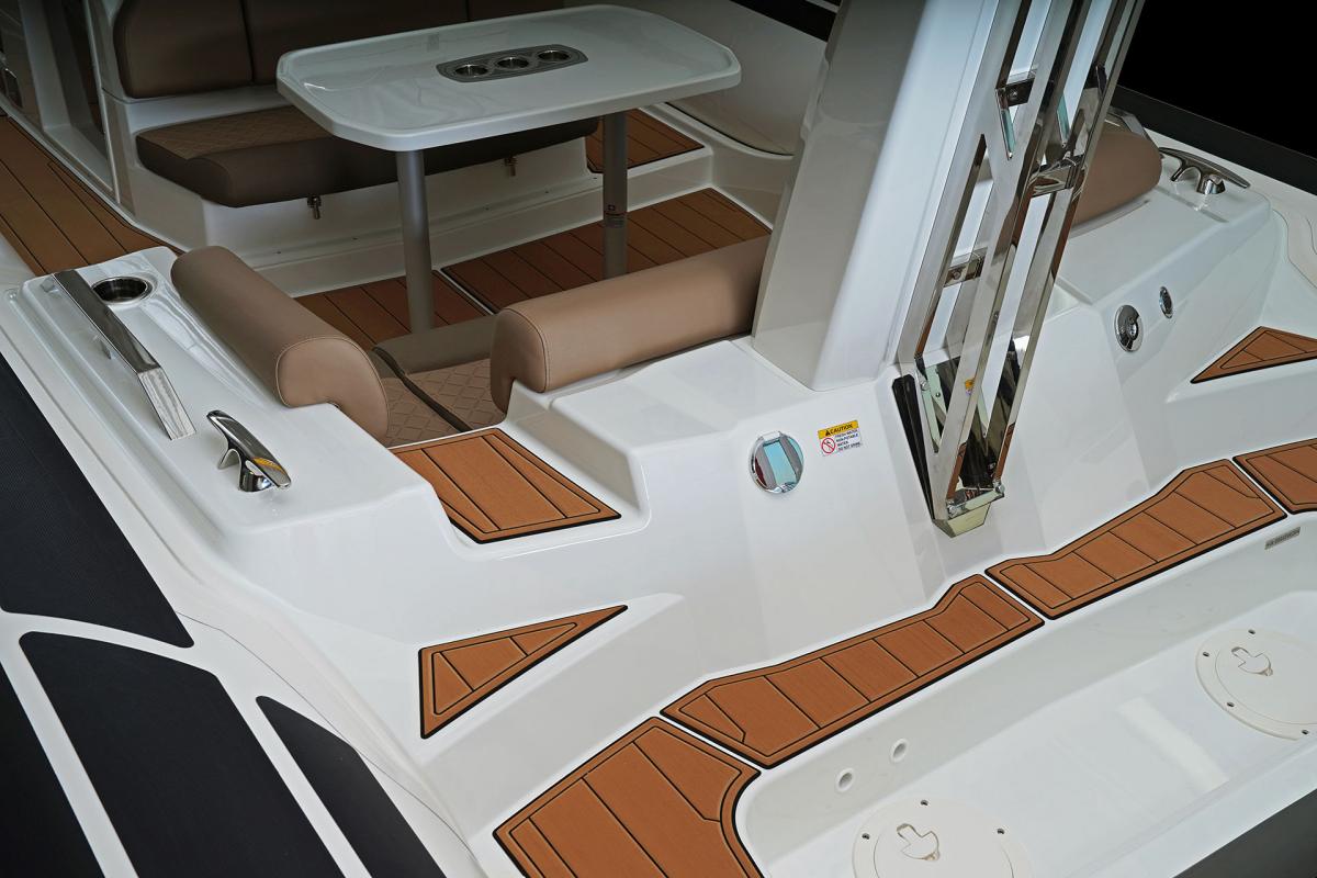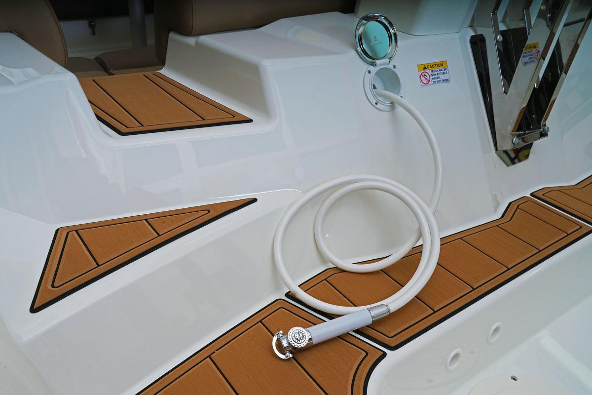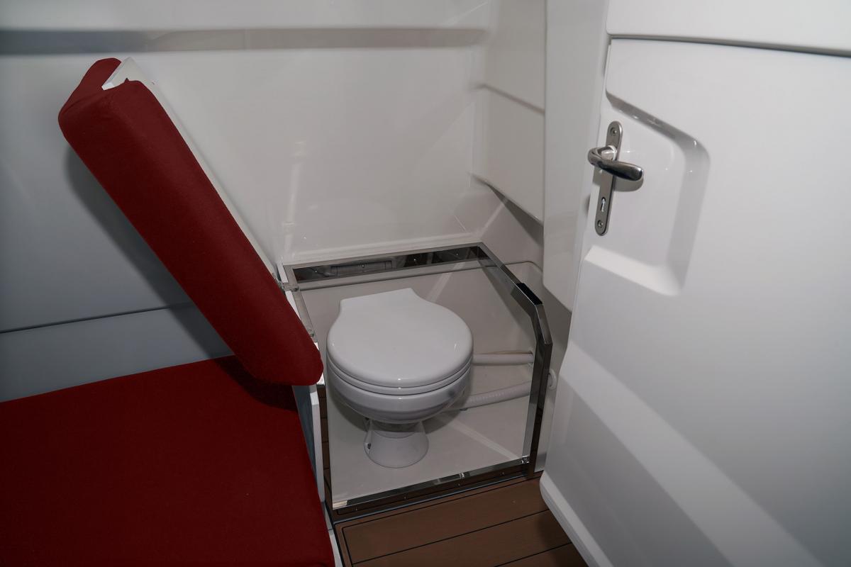 Aan comfort geen gebrek: comfortabele zitplaatsen, een ombouwbare tafel en zonnedek, een spoelunit met ruimte voor een koelkast of kooktoestel, een praktisch zwemplateau achter met inklapbare ladder en buitendouche, Ên een goed uitgeruste cabine met een tweepersoonsbed.