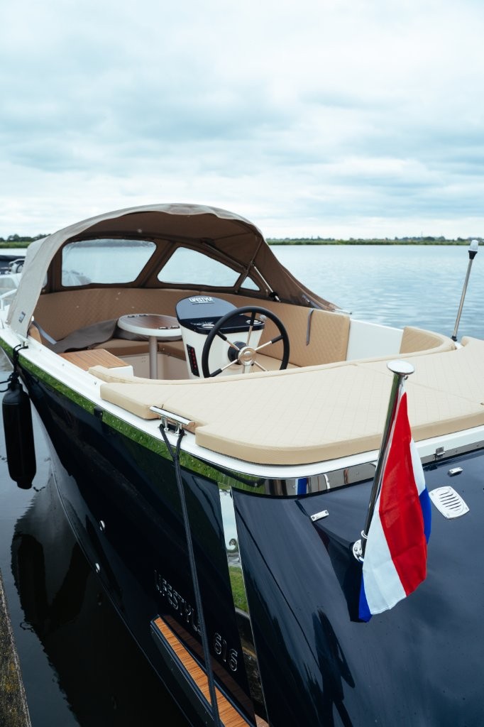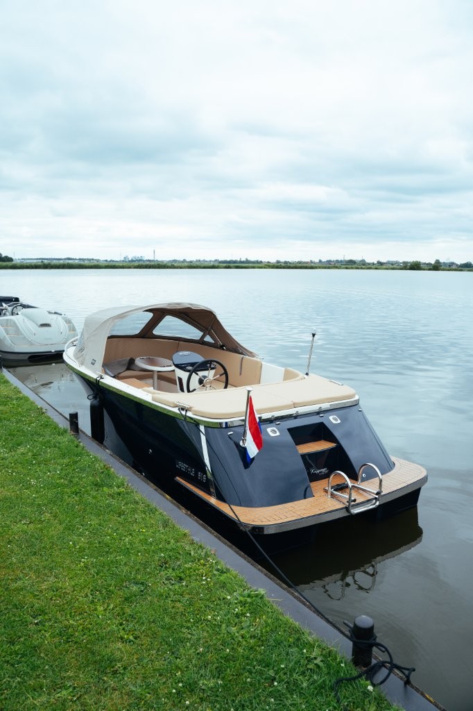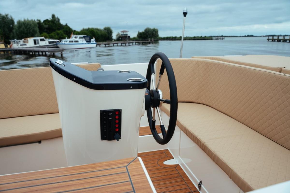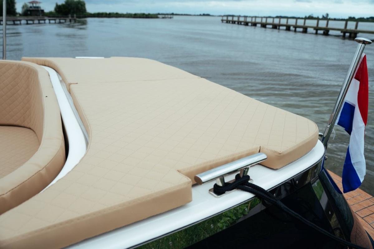 De strakke belijning en het unieke onderwaterschip zorgen ervoor dat deze tender niet alleen een lust voor het oog is, maar ook een waar genot om mee te varen. Je kunt rekenen op koersvaste, en optioneel ook snelvarende, vaareigenschappen. Het ontwerp is volledig doordacht om optimaal comfort te bieden. De uitzonderlijk hoge rugleuningen zorgen voor ergonomisch zitplezier, terwijl de ruime rondzit en diepe opbergvakken de boot praktisch en gebruiksvriendelijk maken. Achter op de boot bevindt zich een zonnedek waar je heerlijk kunt zitten of liggen terwijl de schipper aan het varen is. Dit unieke design zorgt ervoor dat je dicht bij elkaar kunt blijven en samen kunt genieten van de omgeving, zelfs tijdens het varen. Het is bovendien ideaal voor je trouwe viervoeter, die hier comfortabel kan ontspannen en mee kan genieten van de frisse lucht en het uitzicht. Het zonnedek maakt de ervaring op het water nog completer en gezelliger.