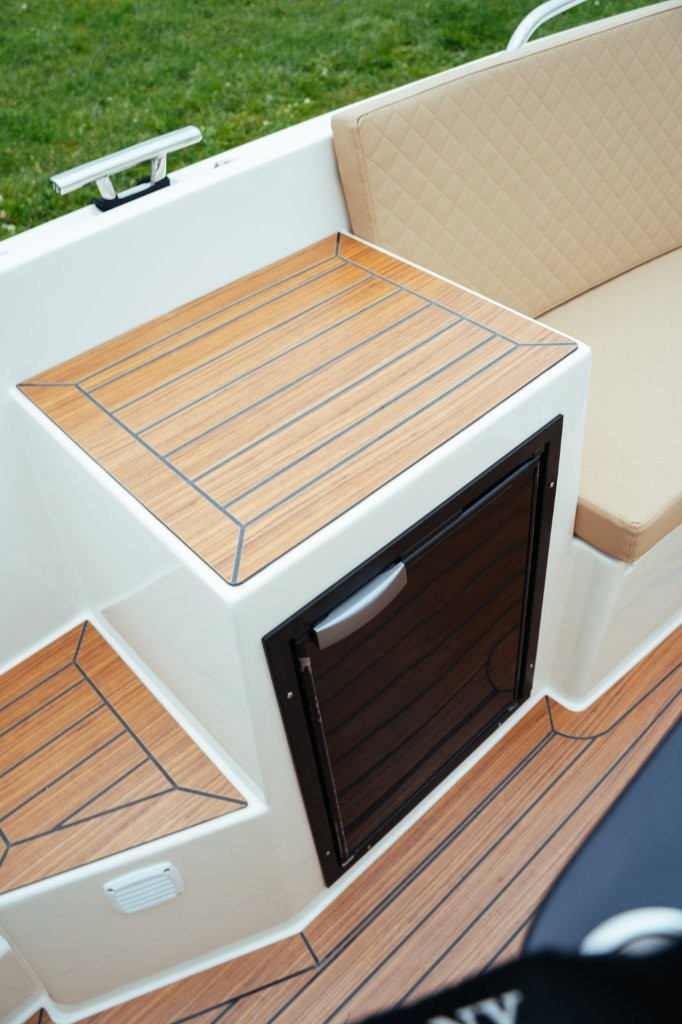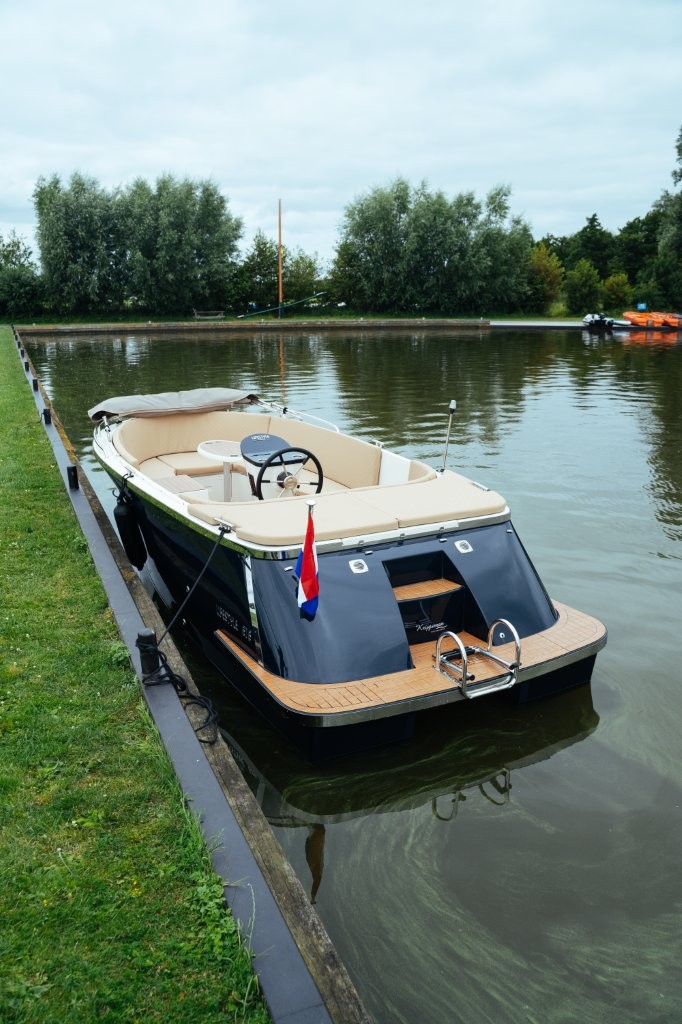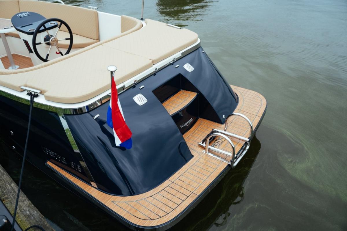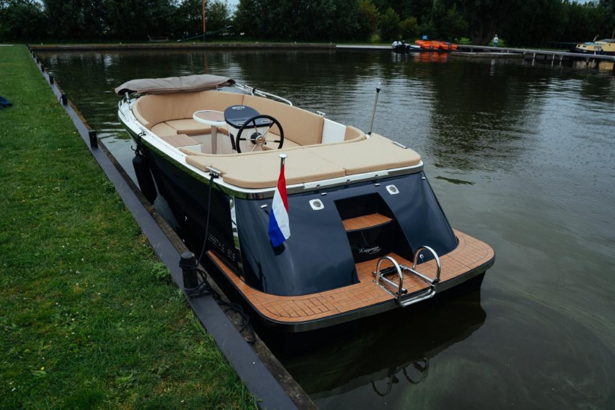 De strakke belijning en het unieke onderwaterschip zorgen ervoor dat deze tender niet alleen een lust voor het oog is, maar ook een waar genot om mee te varen. Je kunt rekenen op koersvaste, en optioneel ook snelvarende, vaareigenschappen. Het ontwerp is volledig doordacht om optimaal comfort te bieden. De uitzonderlijk hoge rugleuningen zorgen voor ergonomisch zitplezier, terwijl de ruime rondzit en diepe opbergvakken de boot praktisch en gebruiksvriendelijk maken. Achter op de boot bevindt zich een zonnedek waar je heerlijk kunt zitten of liggen terwijl de schipper aan het varen is. Dit unieke design zorgt ervoor dat je dicht bij elkaar kunt blijven en samen kunt genieten van de omgeving, zelfs tijdens het varen. Het is bovendien ideaal voor je trouwe viervoeter, die hier comfortabel kan ontspannen en mee kan genieten van de frisse lucht en het uitzicht. Het zonnedek maakt de ervaring op het water nog completer en gezelliger.